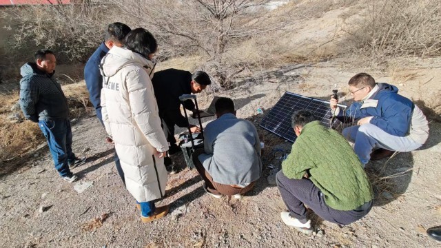 中青报·中青网记者正在拍摄拉萨中心站工作人员架设流动地震监测台站。西藏自治区地震局供图