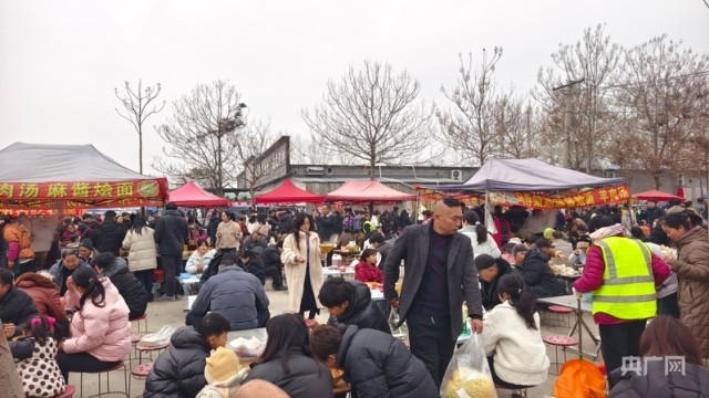 集市里人头攒动,各个摊位前生意火爆。“这儿特别热闹,年味儿十足!和家人品尝了洧川麻酱烩面,还买了豆腐、锅盔等本地特产。”游客张先生拎着购买的年货,笑意盈盈。