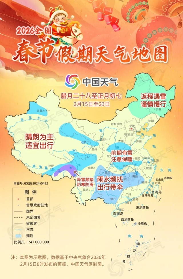 春节假期(腊月二十八至正月初七),我国无大范围雨雪冰冻等灾害天气,总体适宜出行;全国大部地区气温较常年同期偏高1至3℃,但气温起伏较大;节日中期天气条件较好,节日前期和后期将有降水降温过程。