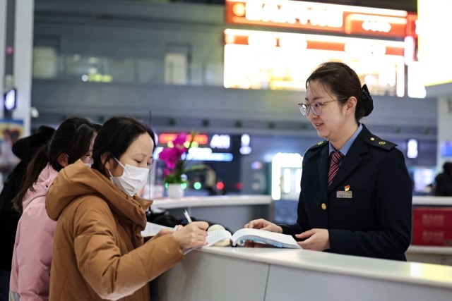 2026年2月2日,甘肃兰州西站工作人员为旅客提供服务。新华社发(侯崇慧 摄)