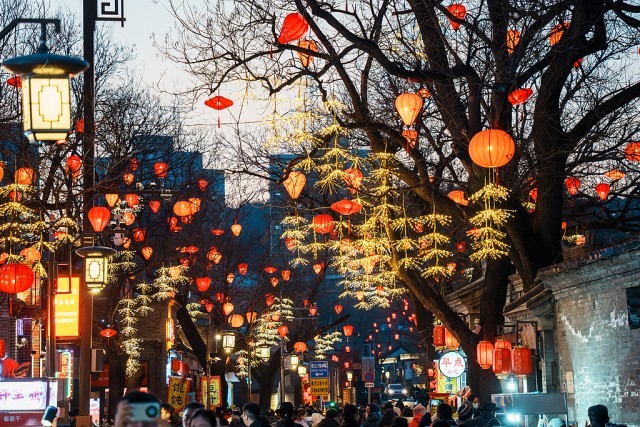 当我抵达令人又熟悉、又陌生的“模式口历史文化街区”时,天色已经暗了下来。街口一排灯笼亮起,烘托出暖洋洋的年味。顺着人流往里走,街道两侧是修缮一新的院落和门脸,灯光映着青砖灰瓦,既有节日的热闹,也保留了老房子的厚重感。年轻人举着手机取景,孩子追着发光装置跑,老人慢慢走在一旁,组成了一幅充满活力的节庆画卷。