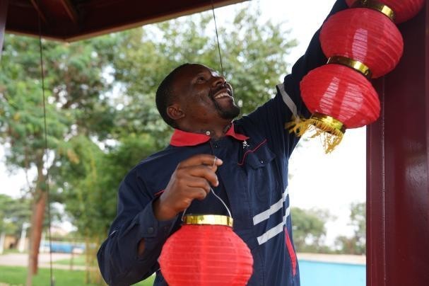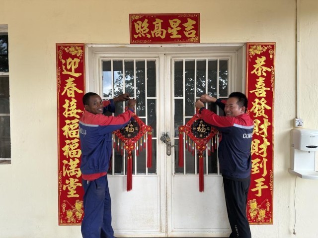 中方和刚果(金)员工围聚一起,贴春联、挂灯笼、装彩灯,一张张笑脸映着喜庆的红灯笼,空气中处处弥漫着浓浓的年味。刚果(金)当地员工恩戈伊掏出手机,对准红灯笼和身边的伙伴,将这份跨越国界的喜庆与温情,定格在镜头里。
