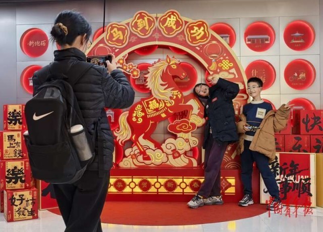 2月14日,北京地安门商场,两位小朋友正在“马到成功”打卡点前拍照留念。中青报·中青网记者 陈剑/摄