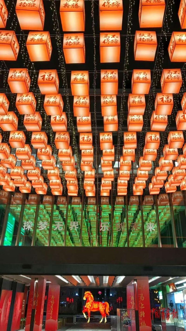 2月15日晚,位于北京前门大街旁的廊房头条,在巨幅生肖马年海报旁,游客正在拍摄头顶的花灯。中青报·中青网记者 陈剑/摄