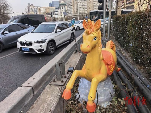 2月9日,北京东四十条环岛绿化带,放置着一个独角马的雕塑,一辆宝马车从旁边的公路上驶过。中青报·中青网记者 陈剑/摄