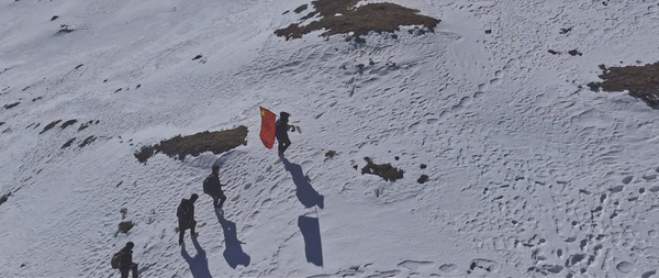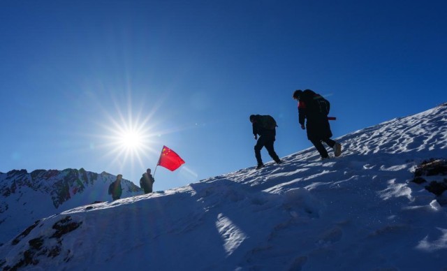 在西藏山南市隆子县玉麦乡境内,护边员们在雪坡上巡逻(2月6日摄)。新华社记者 丁增尼达 摄
