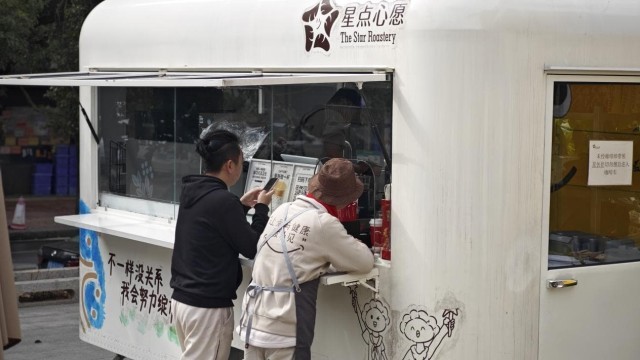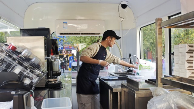 肖宇宏在咖啡车上进行闭店内务处理(记者江晓晨 摄)