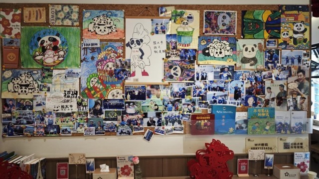 店内一面墙上贴着照片和星青年画的画(记者江晓晨 摄)