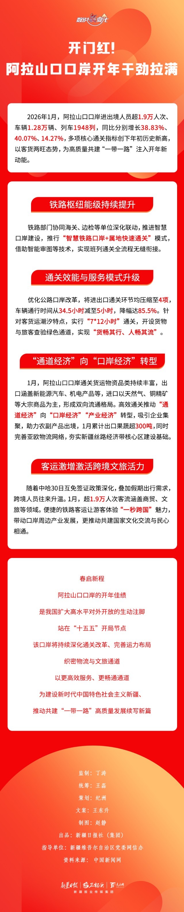2026年1月,阿拉山口口岸进出境人员超1.9万人次、车辆1.28万辆、列车1948列,同比分别增长38.83%、40.07%、14.27%,多项核心通关指标创下年初历史新高。亮眼数据的背后,是口岸通关效能与服务模式的双重升级。本期《数说“新”变化》一起来看看。