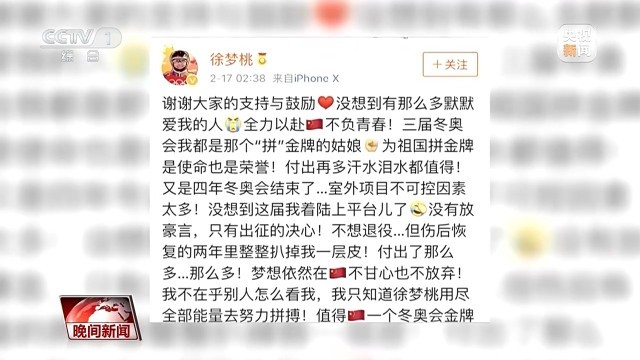 经过手术后艰难的康复,徐梦桃如期站在了2018年平昌冬奥会的赛场上,但最终只获得了第九名。赛后,徐梦桃这样写道:为祖国拼金牌是使命也是荣誉,付出再多汗水、泪水都值得,梦想依然在,不甘心也不放弃。