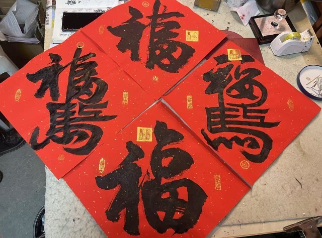 马年春节,顾客订购“福”字,王建宇的“福”字每一个写法都不一样