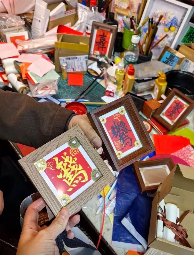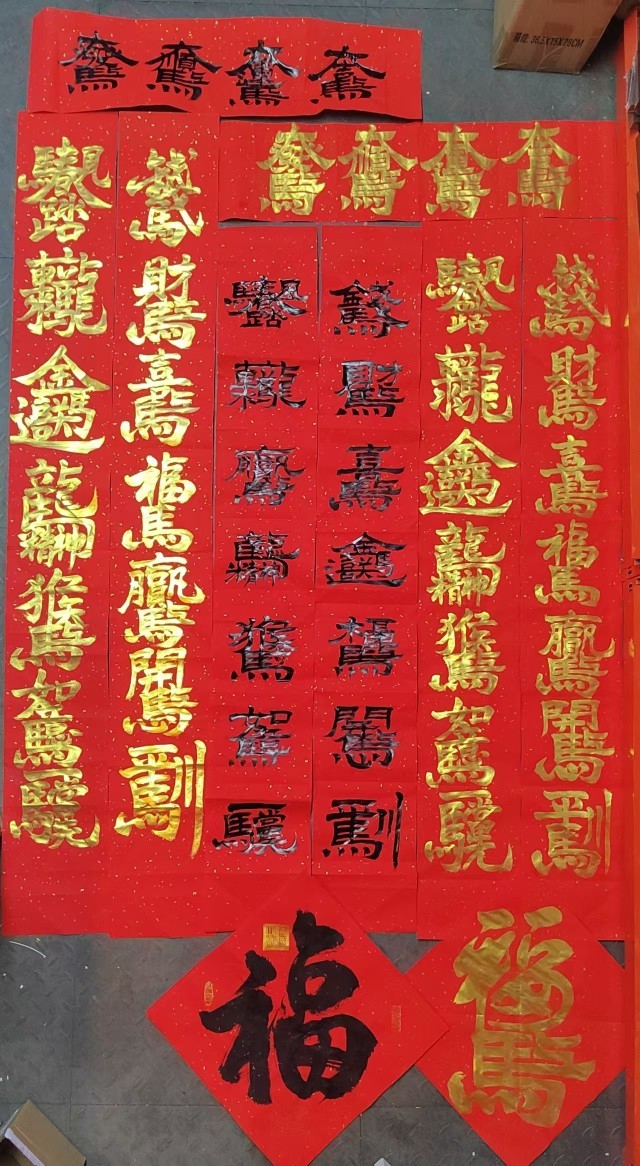 马年春节,山东的顾客定了20个装裱进摆台的福字,蓝底掸金、红笔勾勒……每一个写法都不一样;北京的朋友又来约6张用洒金纸现写的福字;还有四川的顾客想要一整套春联。