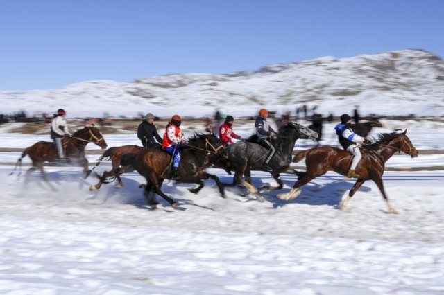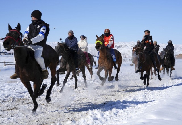 在新疆昭苏县萨尔阔布镇,当地牧民在参加叼羊比赛欢度新春佳节(2月14日摄)。新华社发(塔力哈尔·叶尔江 摄)