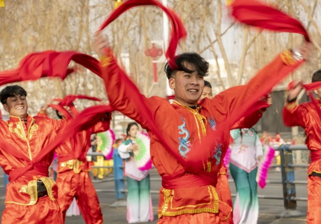在新疆乌鲁木齐市水磨沟区,英歌舞表演队正在演出中(2月21日摄)。新华社发(李文武 摄)