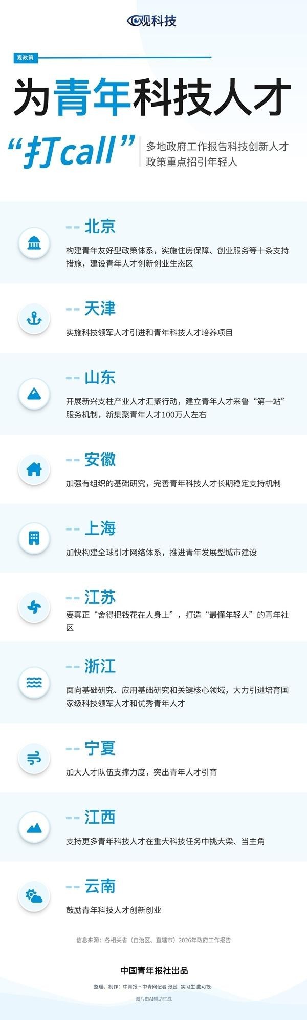 近期,31个省(自治区、直辖市)相继对外公布本地2026年的政府工作报告。中青报·中青网记者梳理发现,“十五五”开局之年,绝大多数省级政府工作报告在谋划发展棋局时,将科技创新相关内容摆在靠前位置、突出位置,整体呈现出科产融合深度化、省内布局再优化、技术攻关靶向化,以及人才支撑精细化等趋势。