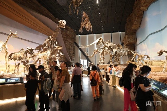 游客在中国古动物馆(保定自然博物馆)参观古生物标本(央广网记者 李瑶 摄)