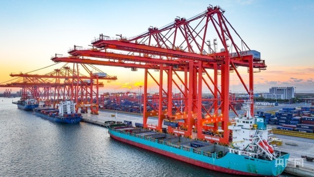 多艘货轮停靠在唐山港自动化集装箱码头进行装卸作业(央广网记者 李瑶 摄)