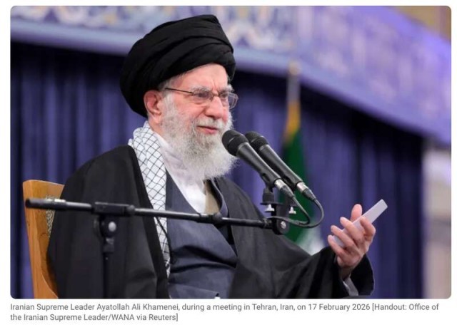 2026年2月17日,伊朗最高领袖哈梅内伊在伊朗首都德黑兰出席会议并发表讲话。卡塔尔半岛电视台截图