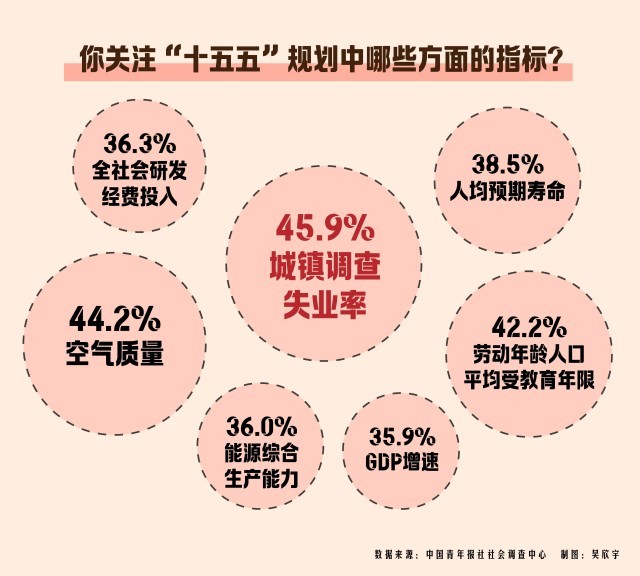 在“十五五”期间,受访者更关注哪些方面的指标?数据显示,城镇调查失业率(45.9%)、空气质量(44.2%)、劳动年龄人口平均受教育年限(42.2%)最受关注。其他还有:人均预期寿命(38.5%)、全社会研发经费投入(36.3%)、能源综合生产能力(36.0%)、GDP增速(35.9%)、粮食综合生产能力(34.5%)、碳排放强度(30.9%)等。