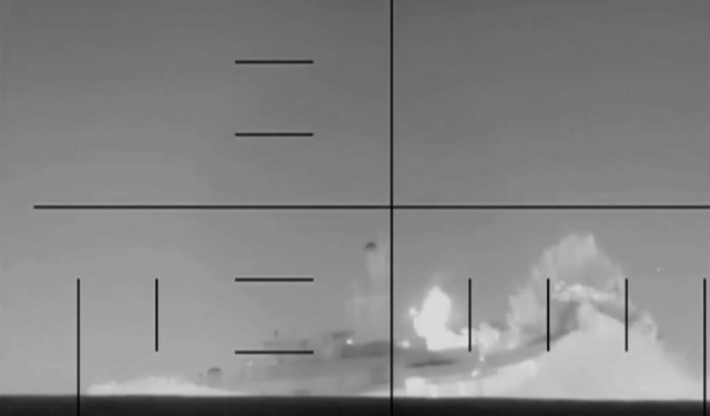 美国国防部发布的视频显示了“德纳”号被鱼雷击中的瞬间。