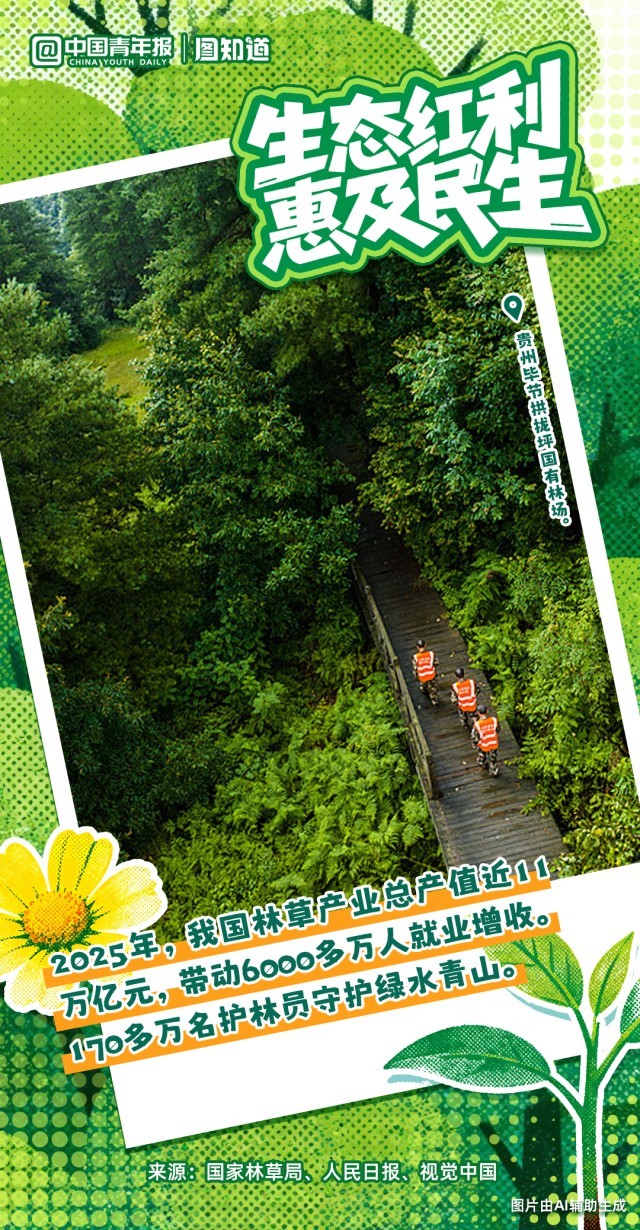 2025年全国森林覆盖率超25%,林草产业总产值近11万亿元,带动6000多万人就业增收……这份沉甸甸的“绿色成绩单”,凝结着无数人的耕耘。值此植树节,种下树木亦是种下未来,让我们一起为美丽中国“充值”,共守绿水青山常在。
