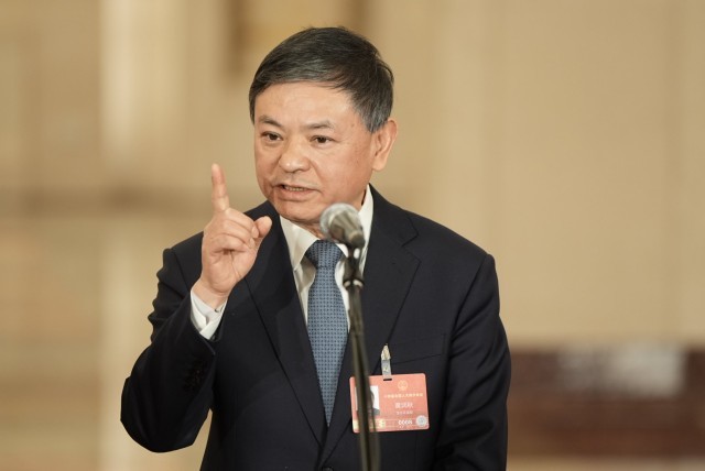 3月12日,北京,部长通道,生态环境部部长黄润秋现场展示了一个DNA的检测信息的芯片。中青报·中青网记者 李隽辉/摄