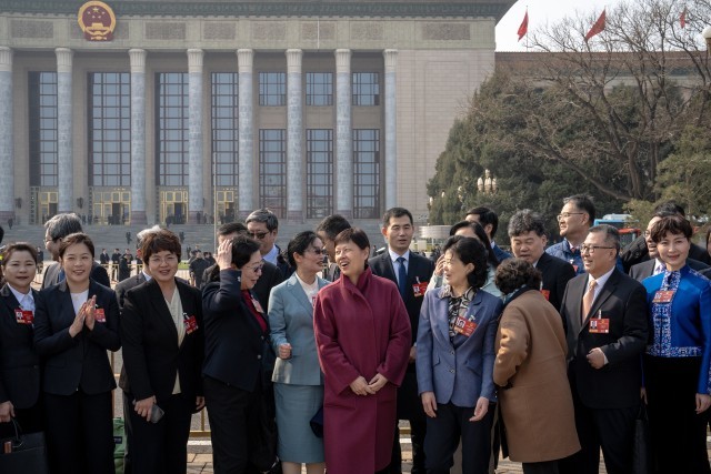 3月12日,北京,人民大会堂外,十四届全国人大四次会议闭幕会开始前,代表们在广场上准备合影留念。当日,十四届全国人大四次会议在圆满完成各项议程后闭幕。中青报·中青网记者 李隽辉/摄