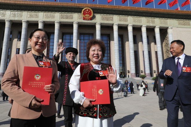 3月11日上午,北京人民大会堂外,全国政协十四届四次会议闭幕会结束后,几位委员手捧会议手册合影留念。中青报·中青网记者 陈剑/摄