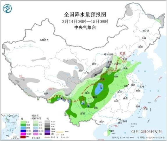 图1 全国降水量预报图(3月13日14时-14日08时)
