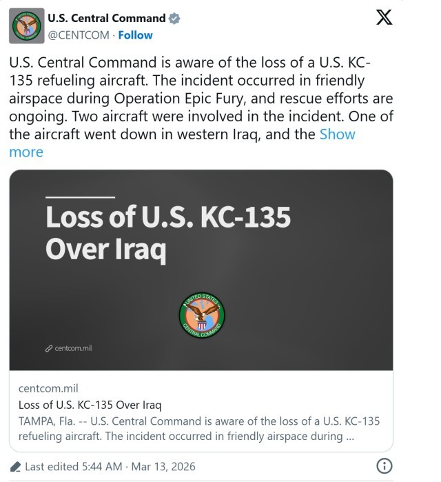 “中央司令部获悉一架KC-135加油机损失。”13日早晨,美军中央司令部通过社交媒体发布消息称,“这起事件发生在‘史诗狂怒’行动期间的友军领空,救援工作仍在进行。事故涉及两架飞机,其中一架飞机在伊拉克西部坠毁,另一架安全着陆。”