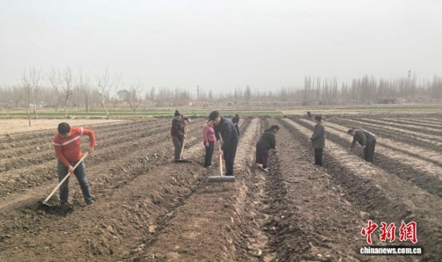 杨永鹏(中)与种植户一起春耕。受访者供图