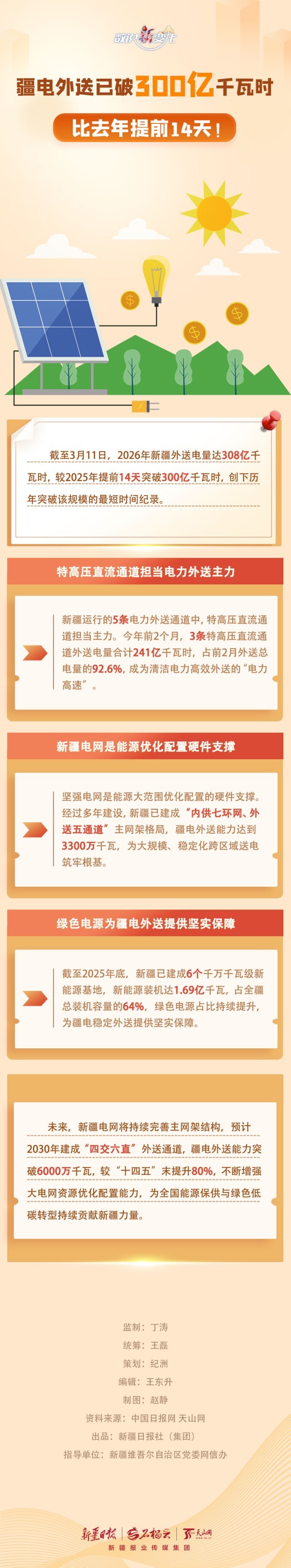 截至3月11日,2026年新疆外送电量达308亿千瓦时,较2025年提前14天突破300亿千瓦时,创下历年突破该规模的最短时间纪录。这一优异成绩是如何取得的?新疆作为国家“三基地一通道”和全国能源资源战略保障基地做了哪些努力?今天的《数说“新”变化》一起来看看。