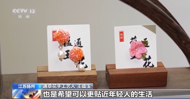 通草花手工艺人 王蕴玉:我们根据最近的季节推出了一些像冰箱贴、胸针、发簪,还有我们的耳饰等一些作品,希望可以更贴近年轻人的生活,让年轻人喜欢。