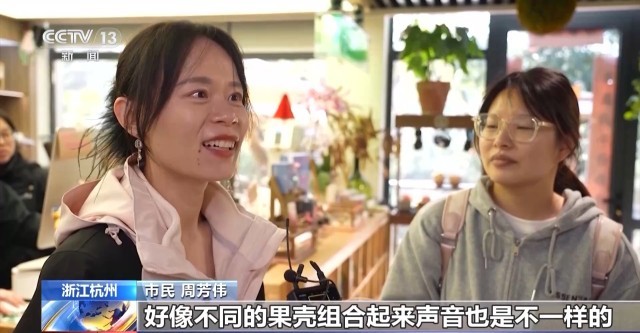 市民 周芳伟:好像不同的果壳组合起来声音也是不一样的,有些像溪流。还有比较柔和的声音,挂在包上还是挺好的。