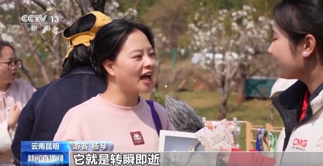 游客 李艳涛:这里的天和这个梨花辉映起来,就有一种说不尽的美,花瓣特别透脆,而且花蕊很丝滑,让我觉得沁人心脾,特别棒。