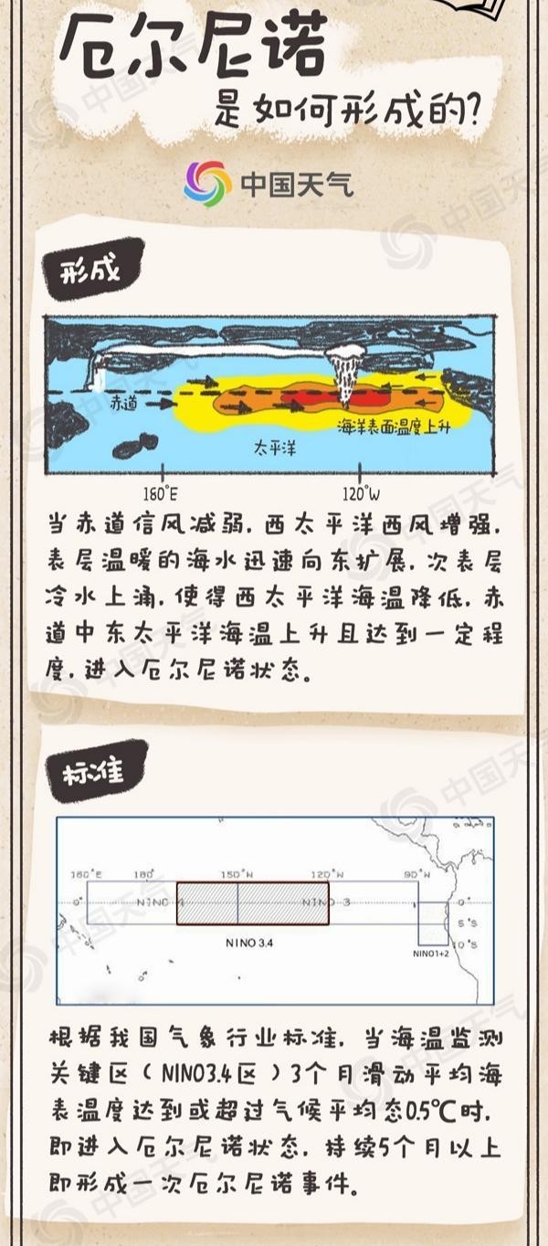 厄尔尼诺名字来自西班牙语,原意是小男孩,是指赤道东太平洋海温持续偏高并造成大气环流异常的一种气候现象。根据我国气象行业标准,当海温监测关键区(NINO3.4区)3个月滑动平均海表温度达到或超过气候平均态0.5℃时,即进入厄尔尼诺状态,这种情况持续5个月以上,即形成一次厄尔尼诺事件。