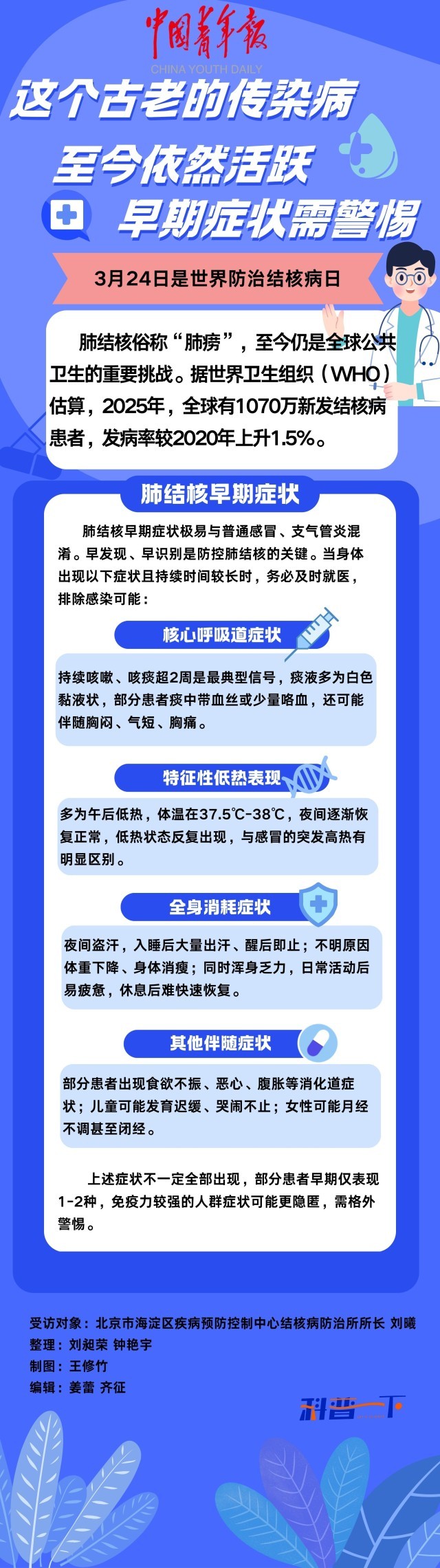 肺结核俗称“肺痨”,至今仍是全球公共卫生重要挑战。据WHO估算,2025年全球有1070万新发结核病患者,发病率较2020年上升1.5%。肺结核早期症状极易与普通感冒、支气管炎混淆,早发现、早识别是防控关键。当身体出现早期症状且持续时间较长时,务必及时就医检查,排除感染可能。(中青报·中青网记者 刘昶荣)
