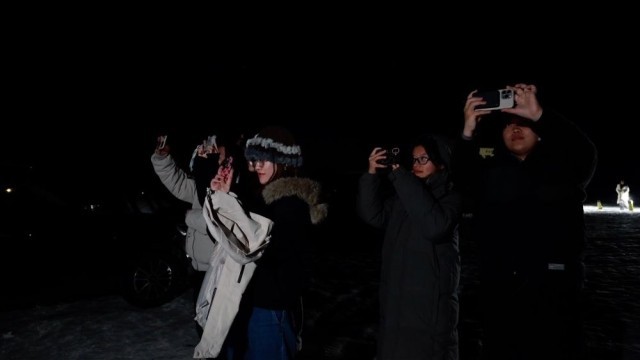 在漠河市北极镇北极村,虽然夜间室外温度非常低,却丝毫没有阻挡大批游客追光的热情。