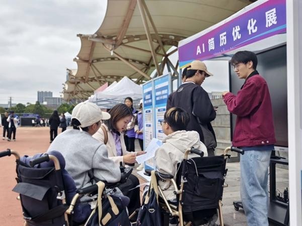 昆明理工大学校园招聘会设AI简历优化展示区,一位负责职业咨询的老师(左二)在为学生进行针对性指导。受访者供图