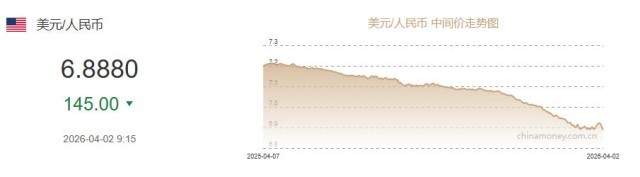 4月2日人民币对美元中间价报6.8880元 上调145个基点