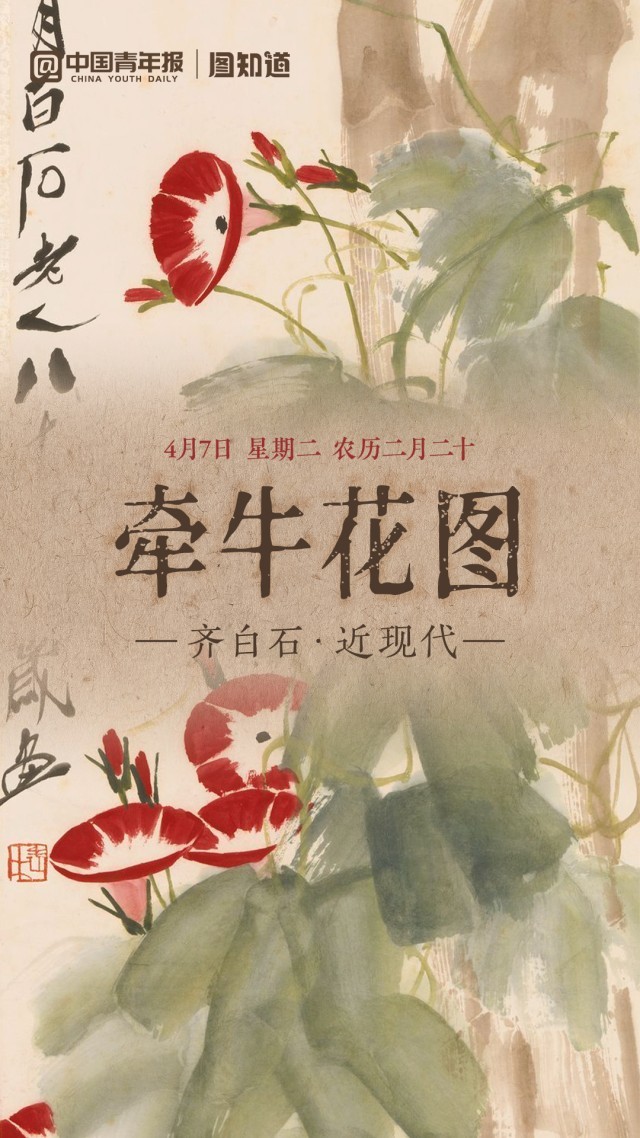 今天是4月7日,星期二,农历二月二十。齐白石的《牵牛花图》绘藤蔓纵横交织,野性倔强;朵朵喇叭花,浓烈绽放,艳而不俗,尽显向阳而生的生命力。愿您的生活如画中繁花,热烈且从容,明朗且欢畅。早安,朋友!(文案/朱梓轩 AI生成、剪辑/李晗)