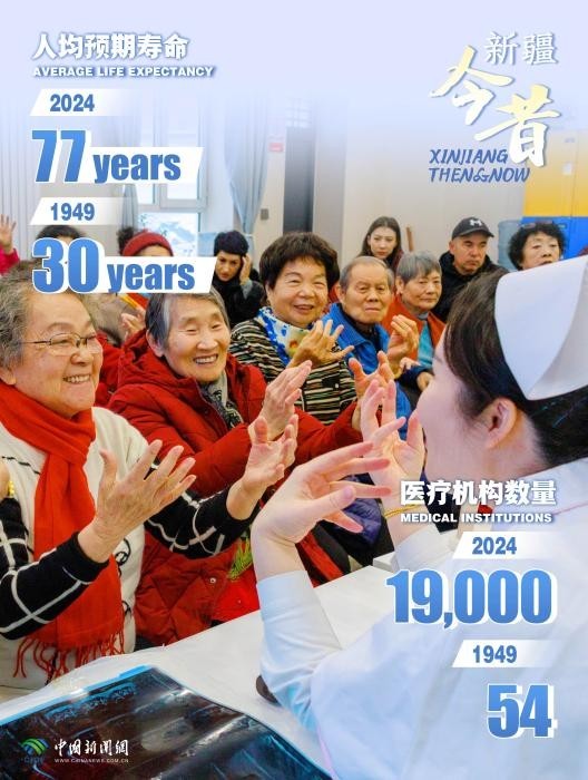 七十多年来,新疆的发展真实可感:人均预期寿命翻番,农村居民人均可支配收入突破2万元。新疆棉花产量、地区生产总值等经济发展关键指标,与公路铁路、医疗机构、学校等公共服务建设,均实现数十倍乃至百倍、千倍增长。