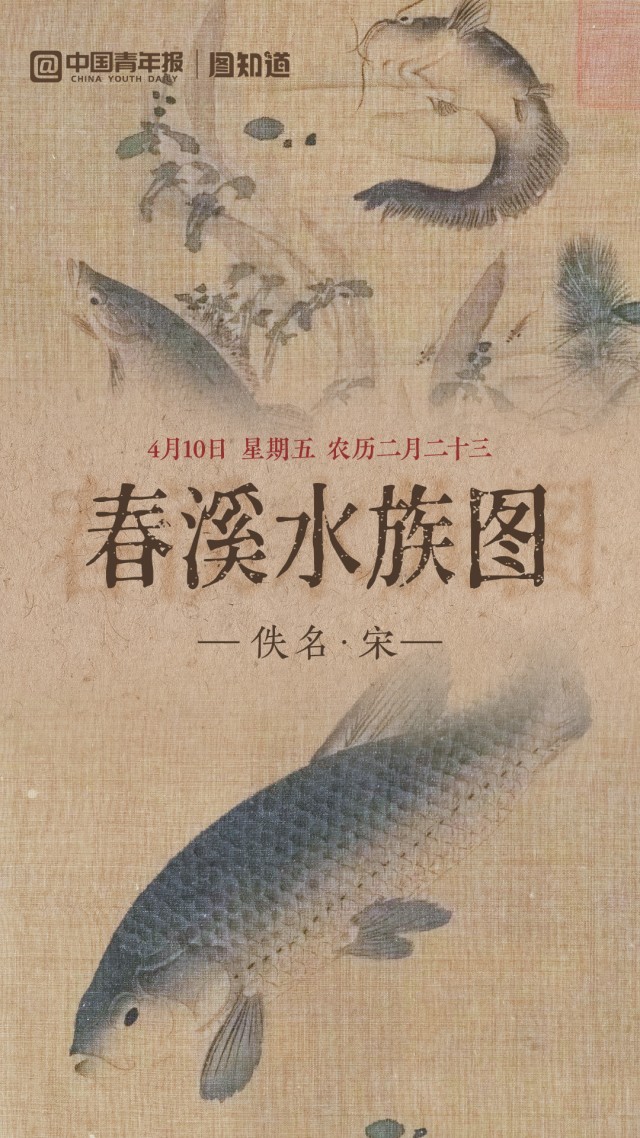 今天是4月10日,星期五,农历二月二十三。《春溪水族图》绘鲢、鲶、鳜三鱼同游,巧寓“连年有贵”之吉祥含义。画中未见一滴水,却借鱼儿弯转之姿与浮藻摇曳之态,尽展春流涌动与清洌透澈,妙趣横生。早安,朋友!(文案/朱梓轩 AI生成、剪辑/李晗)