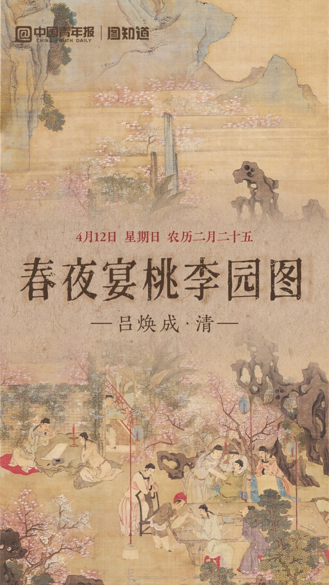 今天是4月12日,星期日,农历二月二十五。《春夜宴桃李园图》绘李白春夜宴桃李园故事。园中桃花灼灼,湖石玲珑,远山壮美。人物生动传神,景致幽雅宜人。早安,朋友!(文案/朱梓轩 AI生成、剪辑/李晗)