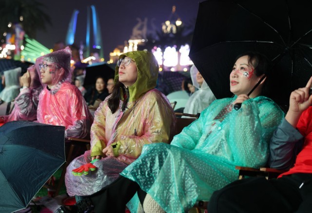 4月11日,观众在常州市迪诺水镇冒雨观看“苏超”揭幕战直播。新华社发(刘臻睿摄)