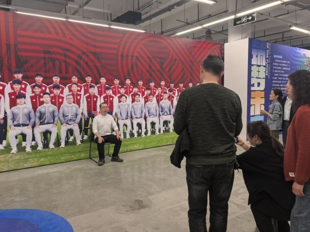 其实是坐在这把椅子上,和背景板中的常州队全家福合影。全家福第一排中央空了个位置,写着“YOU ARE HERE”(你在这里)。