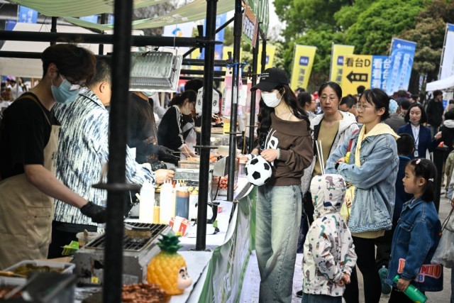 4月11日,观众在常州奥体中心的“苏超”市集上休闲消费。新华社记者 季春鹏 摄