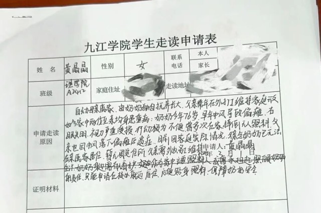 综合新华社、九江学院官微,新学期开学不久,江西九江学院理学院收到一份来自该院大二学生黄晶晶的走读申请表。出于安全考虑,学院对黄晶晶的实际困难进行深入了解,无意间揭开一个令人动容的故事。