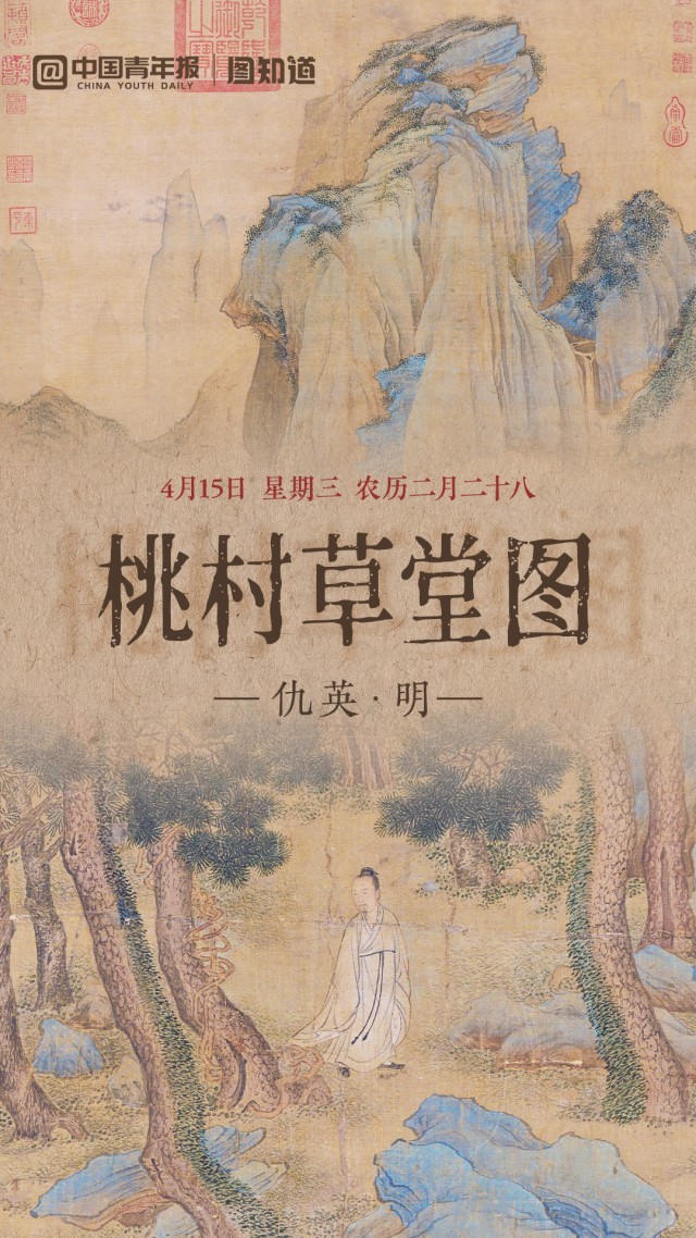 今天是4月15日,星期三,农历二月二十八。《桃村草堂图》绘一老者襟带飘然,仙风道骨。其居也,高山流水,小桥人家。松柏凝翠,桃李争春。云绕草堂,亭净生幽,宛若仙境。早安,朋友!(文案/朱梓轩 AI生成、剪辑/李晗)