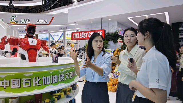 4月15日,第六届消博会科技消费展区,参展商介绍加油机器人及文创产品。中青报·中青网记者 朱彩云/摄